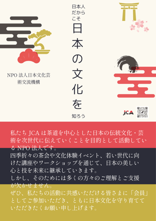 世界に誇れる日本文化に、日本人でありながら触れる機会が少なくなりつつある今、当法人 JCA は、日本の素晴らしさを国内外に拡めていくことを目指します。